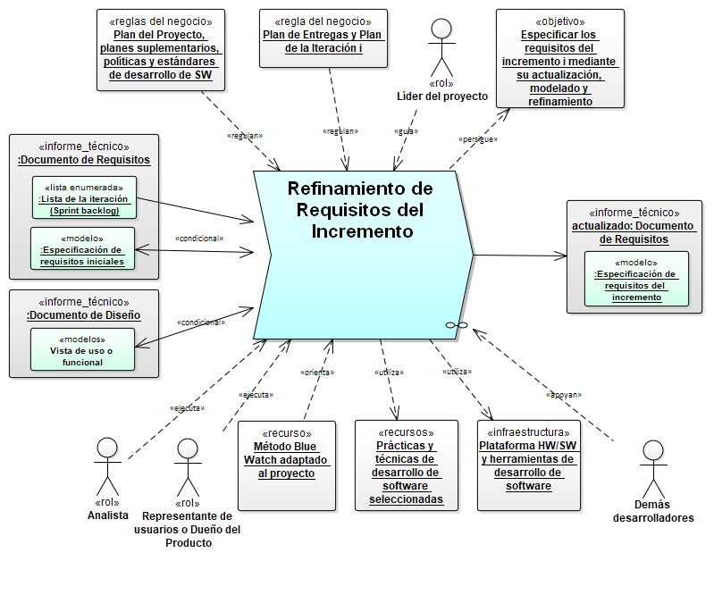 En este proceso, el conjunto de requisitos, que está asociado al incremento que se va a elaborar durante la iteración i, se refina y se especifica en detalle. <br/><br/>Cada requisito funcional del incremento es refinado y modelado usando casos de uso. El resultado es una especificación de requisitos del incremento, la cual debe ser incorporada al Documento de Requisitos de la aplicación, a fin de mantener este documento actualizado.<br/><br/>En aplicaciones muy pequeñas, el Equipo de Desarrollo puede omitir la elaboración de los modelos de casos de uso que caracterizan a la Especificación de Requisitos del Incremento. En este caso, se actualiza sólo la Pila de Historias del Incremento.<br/><br/>En aplicaciones medianas o grandes, si el Equipo de Desarrollo elaboró una especificación de requisitos durante el proceso de Desarrollo Inicial de Requiisitos. Durante el proceso de Refinamiento de Requisitos del Incremento, dicha especificación es refinada considerando sólo aquellos requisitos que corresponden al incremento en desarrollo.<br/><br/>Si durante el proceso de Diseño Inicial de la Aplicación se elaboró una vista funcional de casos de uso, esta vista es, también, usada en este proceso como un insumo, junto a la Pila de Historias del Incremento y la Especificación de Requisitos Iniciales, para elaborar la Especificación de Requisitos del Incremento.<br/>